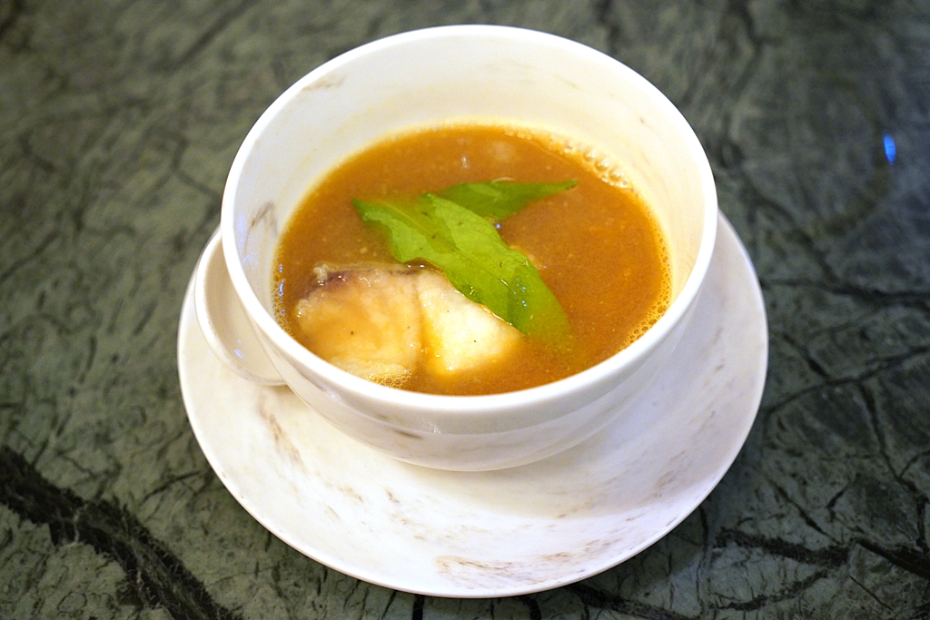 5th course : Buah Paya Masak Titek Soup, slow cooked peppery papaya soup with salted threadfin bones, deep fried threadfin fillet, tiger prawn, laksa leaf [13/20] – ซุปมะละกอพริกไทยและอาหารทะเลรสชาติเข้มข้นเสิร์ฟพร้อมด้วยปลาเนื้อขาวและกุ้งลายเสือ
