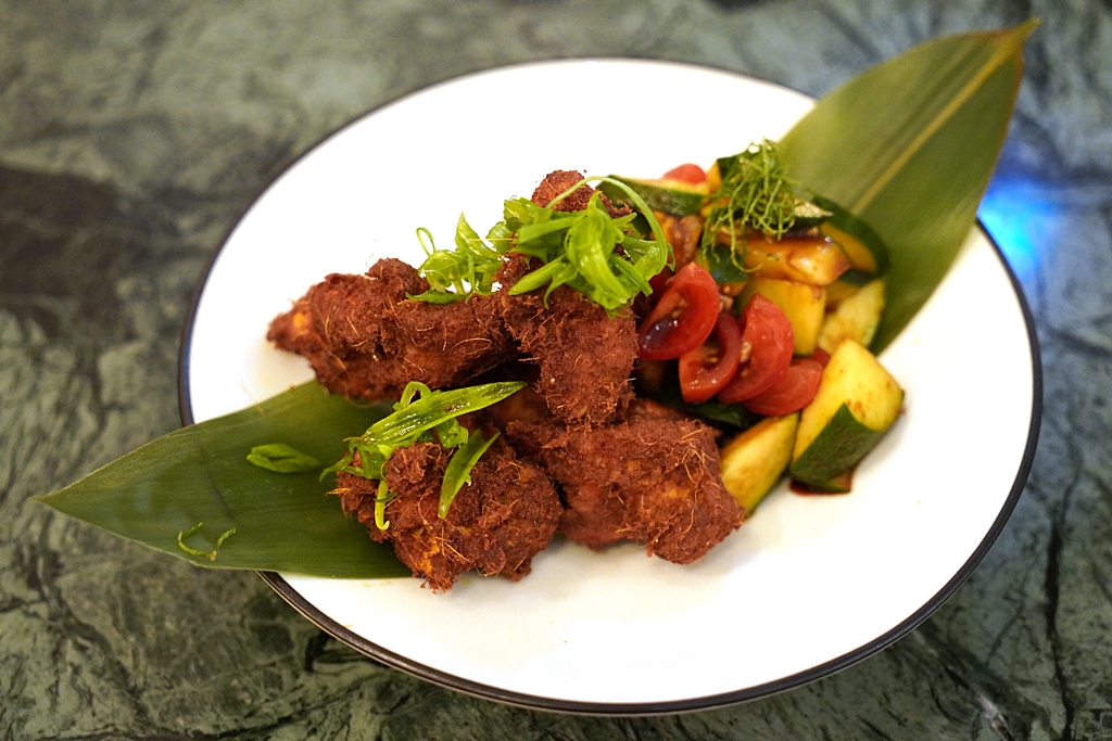 7th course : Ayam Goreng Berempah, deep fried marinated Toh Thye San Anxin chicken thigh with local spices, coconut milk, kicap pedas cucumber and tomato relish [13/20] – สะโพกไก่หมักสมุนไพรแบบเปอรานากันและน้ำกะทิทอดกรอบเสิร์ฟคู่กับสลัดแตงกวากับมะเขือเทศ