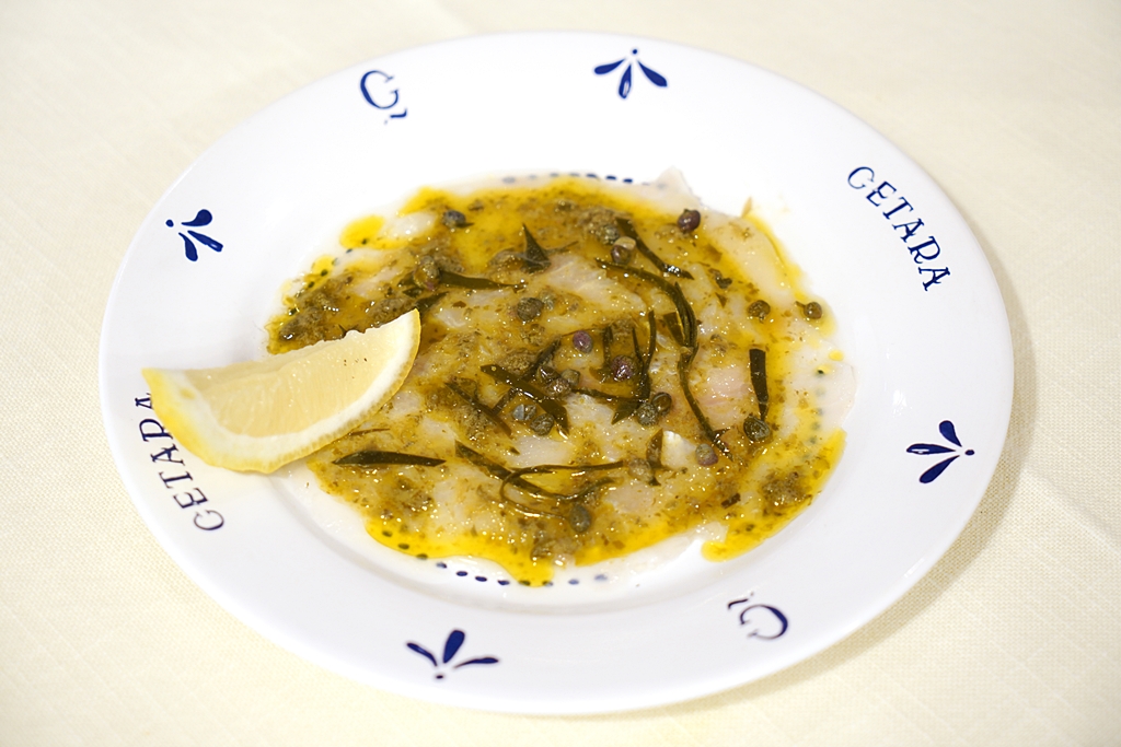 1. Spotted Grouper Crudo Marinated with Amalfi Lemon and Caper Leaves (320++ THB) [16/20] – ปลาเก๋าดิบเนื้อขาวเนียนหมักในน้ำเลม่อนจากแถบชายฝั่ง Amalfi และใบเคเปอร์รสชาติเปรี้ยวหอมสดชื่น