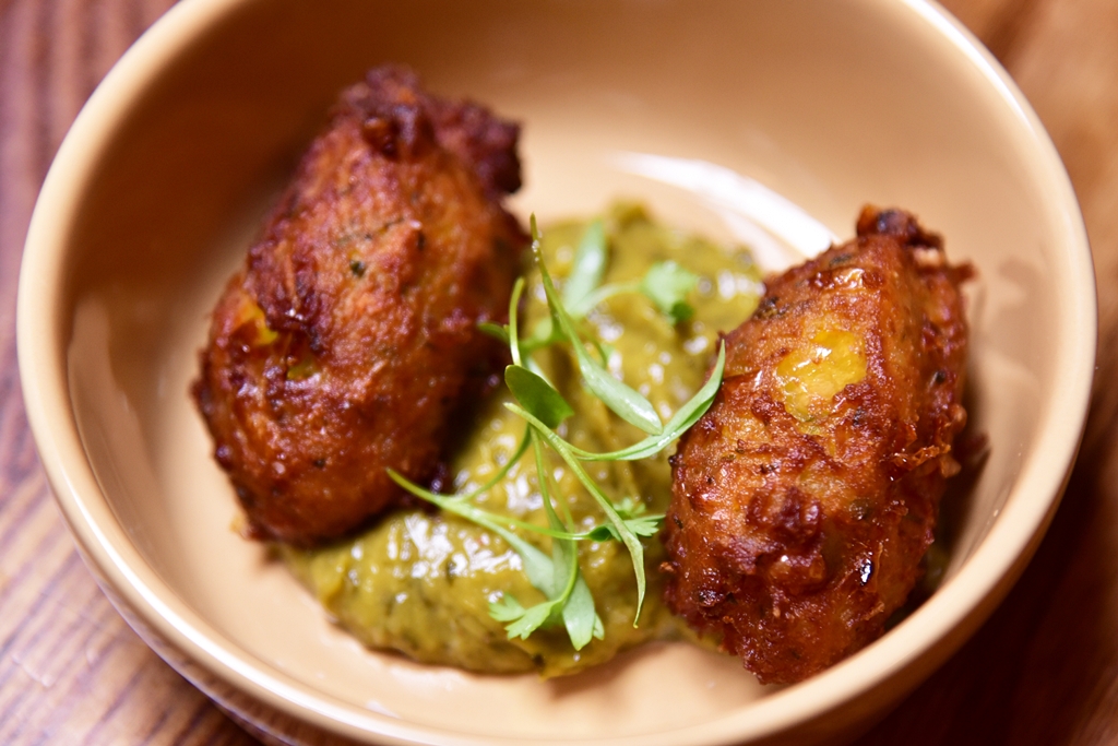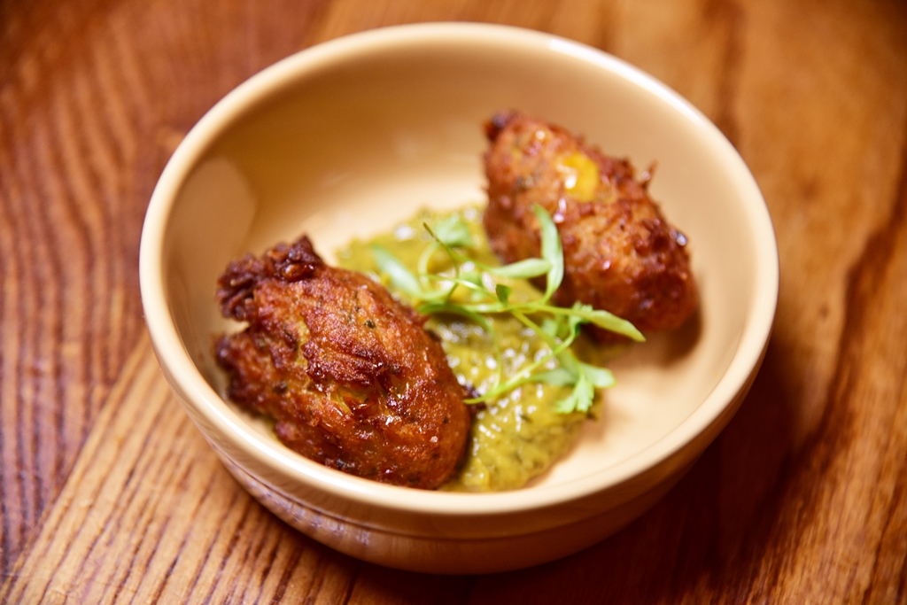 2. Corn Fritters, herb, avocado dip (4+ GBP) – ข้าวโพดบดชุดแป้งทอดกรอบเสิร์ฟคู่กับดิปอโวคาโดผสมเครื่องเทศที่รสชาติดีเยี่ยม
