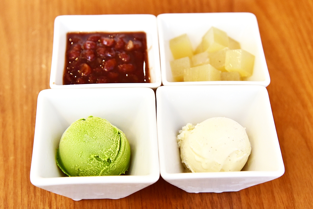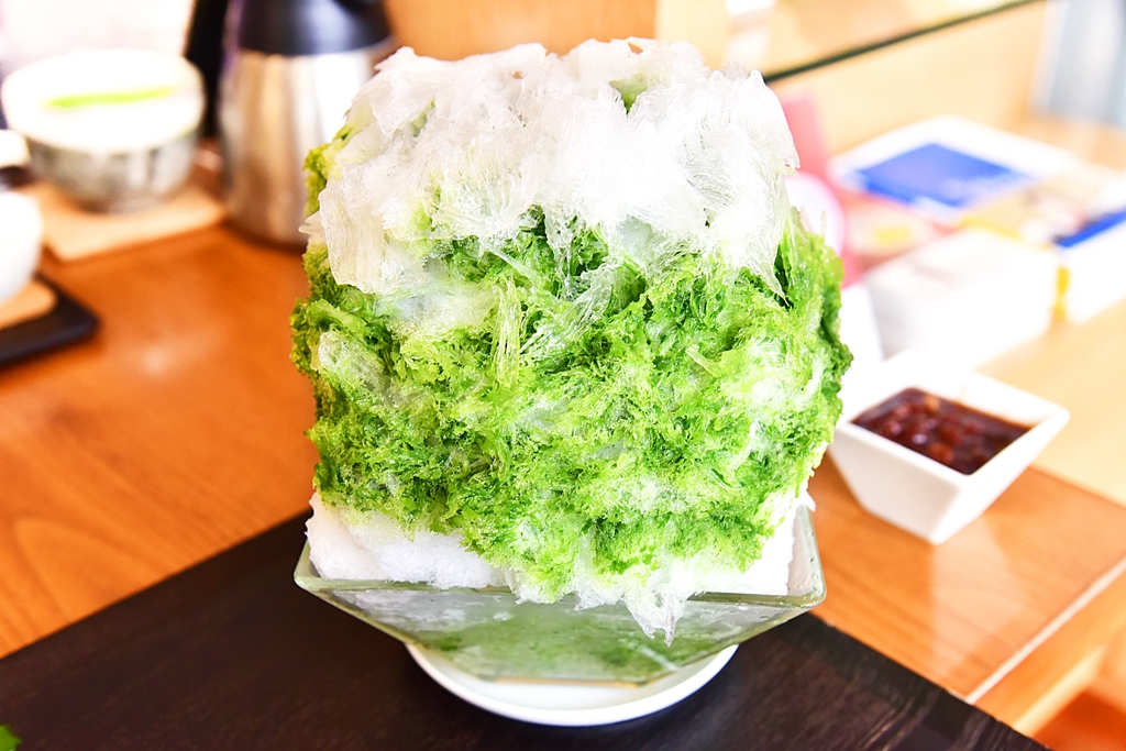 1. Special Matcha Kakigori with Matcha Latte Set (2,400 Yen) – เซ็ตคากิโกริชาเขียวเสิร์ฟคู่กับซอสนมรสหวานมัน ไอศกรีมชาเขียว ไอศกรีมวานิลลา วุ้นมะพร้าวและถั่วแดงญี่ปุ่น พร้อมด้วยมัตฉะลาเต้รสนุ่มละมุน