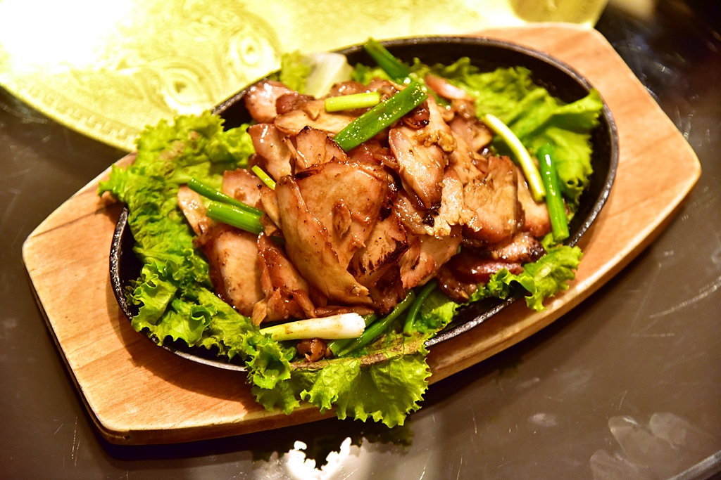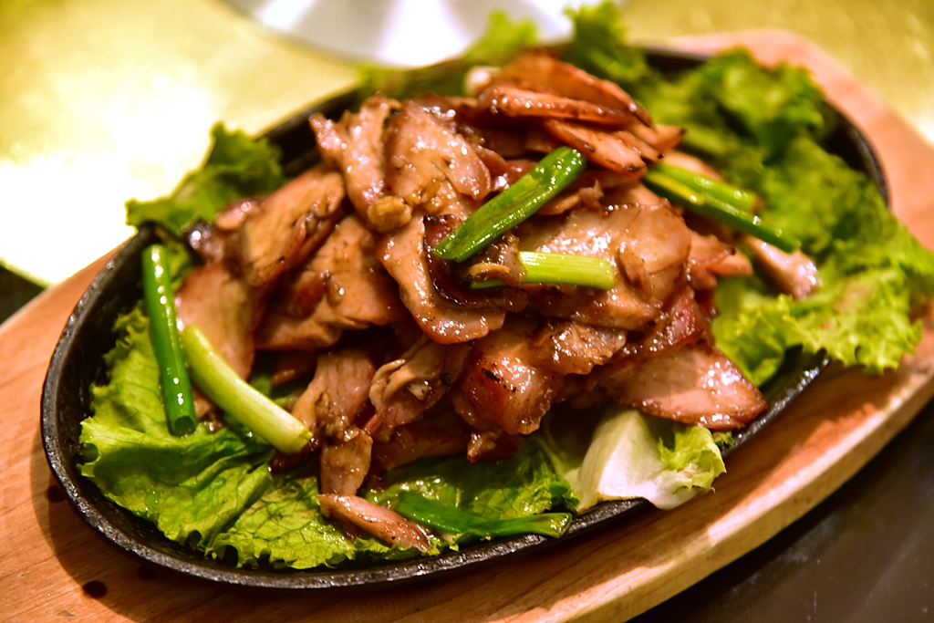 3. Pork in Garlic Sauce (56 Sol) – หมูย่างในซอสกระเทียมเสิร์ฟคู่กับต้นหอมในกระทะร้อน