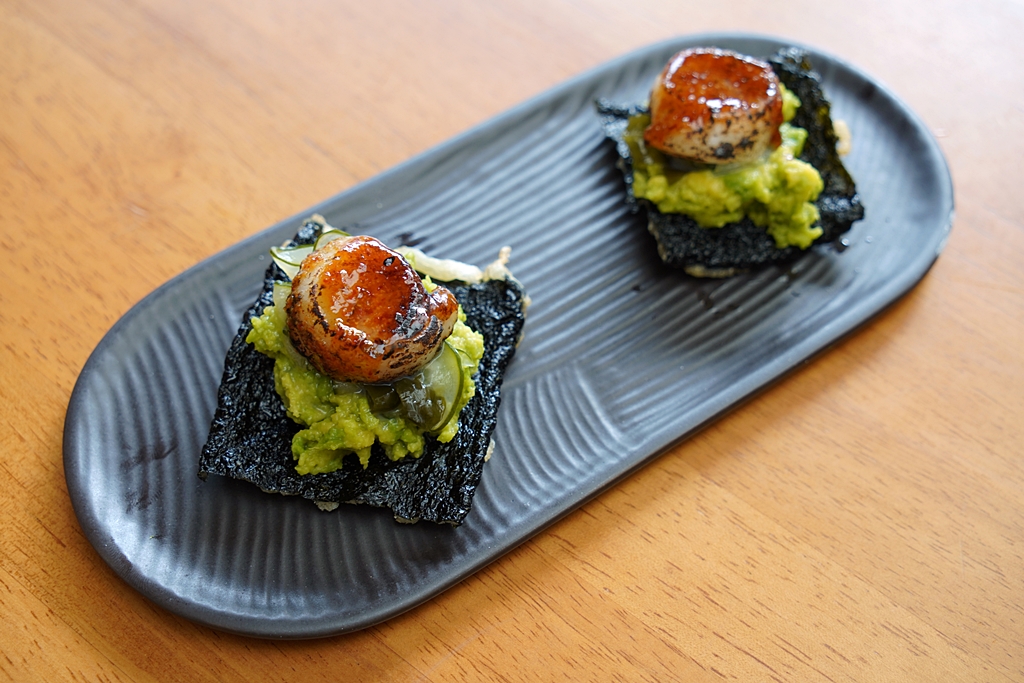 1. Seaweed Taco with Scallop (290++ THB) [13/20] – ทาโก้สาหร่ายชุบแป้งทอดกรอบหน้าหอยเชลล์ฮอกไกโดราดซอสรสเผ็ดหวานพร้อมด้วยอโวคาโด้บดและแตงกวาดอง ถือเป็นเมนูทานเล่นที่แปลกใหม่และอร่อยใช้ได้เลยครับ