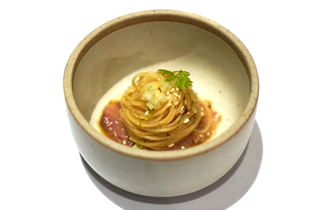 6th course : Szechuan Cold Pasta [16/20] – พาสต้าเย็นเส้นเหนียวหนึบคลุกเคล้ากับน้ำมันงาและพริกเสฉวนเสิร์ฟคู่กับซาชิมิเนื้อปลาคันปาจิดองในน้ำยำและแอปเปิ้ลเขียว เมนูนี้สดชื่นมากๆ