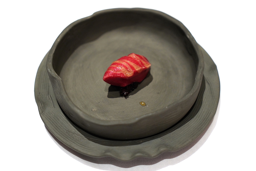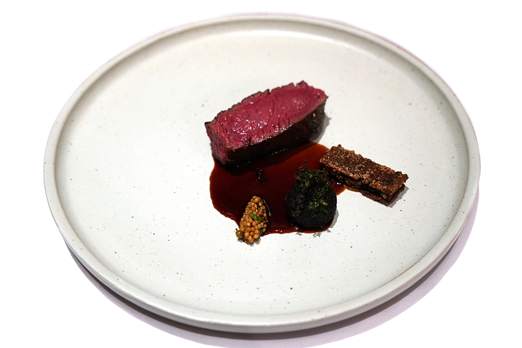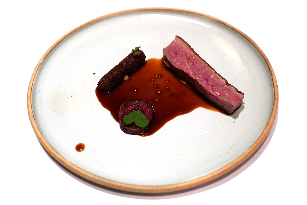 7th course : Five-Spice Dry-Aged Duck [15/20] – เนื้อเป็ดดรายเอจเนื้อนุ่มหนังกรอบหอมเสิร์ฟกับซอสจูซเป็ดกับเครื่องเทศแบบจีน 5 ชนิดพร้อมด้วยขนมผักกาดบีทรูทและบีทรูทดองม้วนกับลูกแพร์