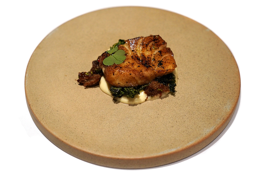 8th course, 2nd option : Gindara [15/20] – เนื้อปลากินดาระย่างมาได้อย่างดีเสิร์ฟในคอนเส็ปต์ “ราดหน้าเนื้อปลาเต้าซี่” บนมันฝรั่งพิวรีและขนมปังซอร์โดว์กรุบกรอบ
