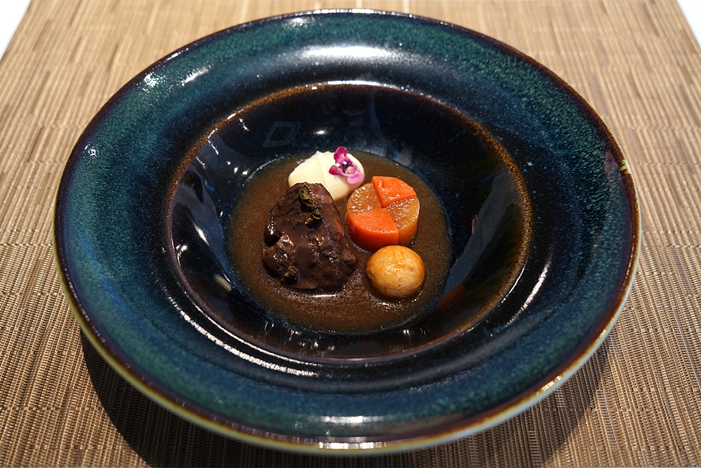 8th course : Beef Cheek Bourguignon [15/20]เนื้อตุ๋นไวน์แดงสมุนไพรจีนที่ใช้แก้มวัวออสเตรเลียตุ๋นจนเปื่อยนุ่มเสิร์ฟคู่กับพริกหมาล่า พิวรีดอกกะหล่ำและผักต้ม