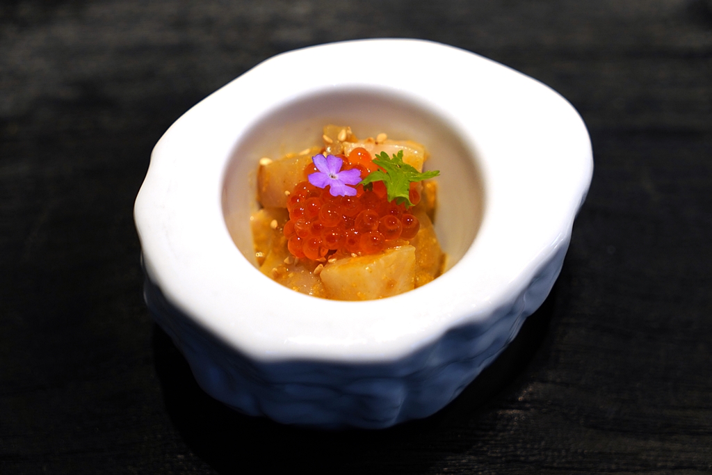 3rd course : Raw Fish Salad [16/20]“ฮื่อแซ้” หรือ “ยำปลาดิบแบบแต้จิ๋ว” ที่ใช้ปลาคัมปาจิซาชิมิกับไข่ปลาเทราท์คลุกเคล้ากับงาและเครื่องแบบจีน
