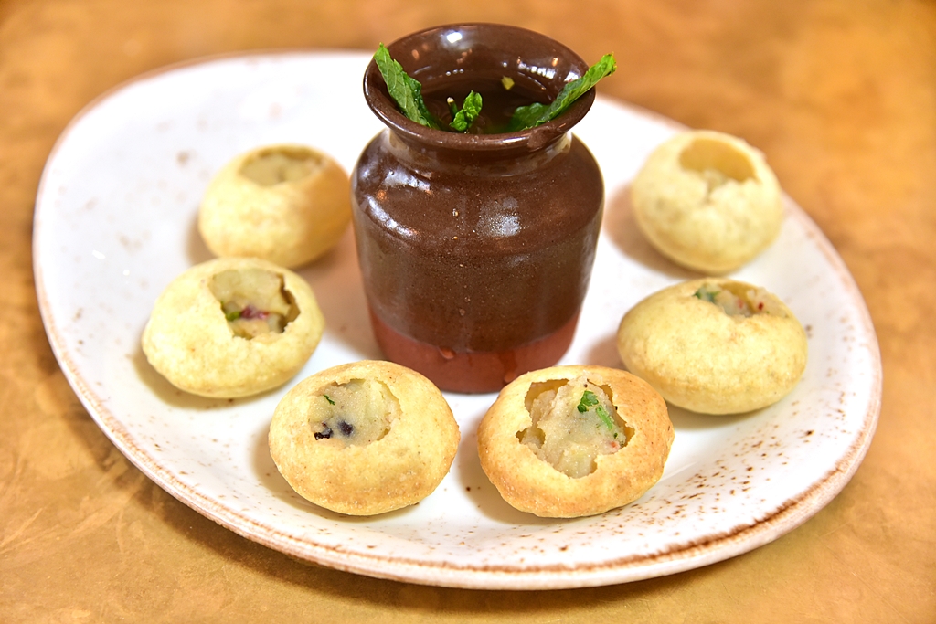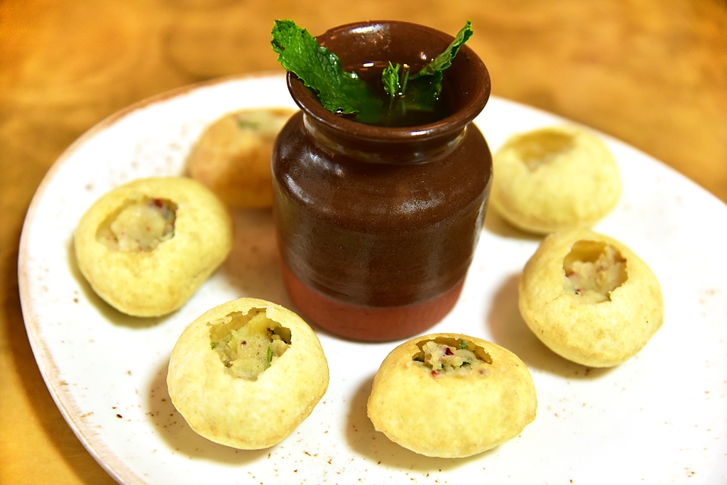 2. Puchkas (7.0 GBP) – แป้งข้าวสาลีกรอบก้อนกลมสอดไส้มันฝรั่งและถั่วชิคพีปรุงรส เสิร์ฟคู่กับน้ำมะขามรสชาติเปรี้ยวหวานสดชื่น วิธีการทานนั้นต้องเริ่มจากการเทน้ำมะขามลงในแป้งข้าวให้ชุ่มแล้วหยิบเข้าปากทั้งคำ รสชาตินี่ทะลักเต็มปากเลย