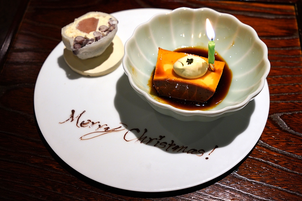 8th course : Dessert [14/20] – เมนูของหวานปิดท้ายมื้ออาหารที่ก็เป็นวันคริสต์มาสพอดีที่มีอยู่ด้วยกัน 2 รายการ ได้แก่ พุดดิ้งคาราเมลครีมชาเขียวและไดฟุกุไส้ไอศกรีมถั่วแดง