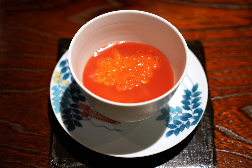 1st course : Chawanmushi | Tomato | Ikura [16/20] – “แฟลน” ไข่ตุ๋นเนื้อเนียนนุ่มละมุนเสิร์ฟคู่กับพิวรีมะเขือเทศรสเปรี้ยวหวานสดชื่นตบท้ายด้วยไข่ปลาแซลม่อนเพิ่มความอูมามิ