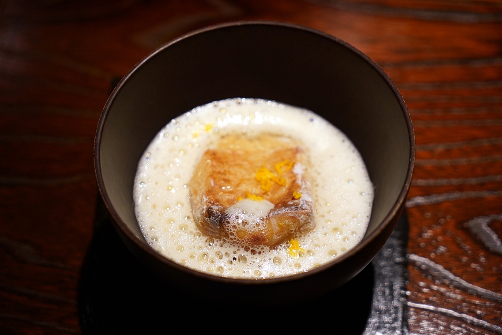 2nd course : Sesami Tofu | Celeriac [17/20] – เต้าหู้ที่ทำจากงาและแป้งแทนถั่วแดงเสิร์ฟแบบร้อนระดับลวกปากได้คู่กับซอสครีม celeriac (หัวขึ้นฉ่ายฝรั่ง) รสละมุนหวานนิดๆ ตัวเนื้อสัมผัสของเต้าหู้งามีความคล้ายกับ bread pudding หยุ่นๆร้อนๆหอมๆ