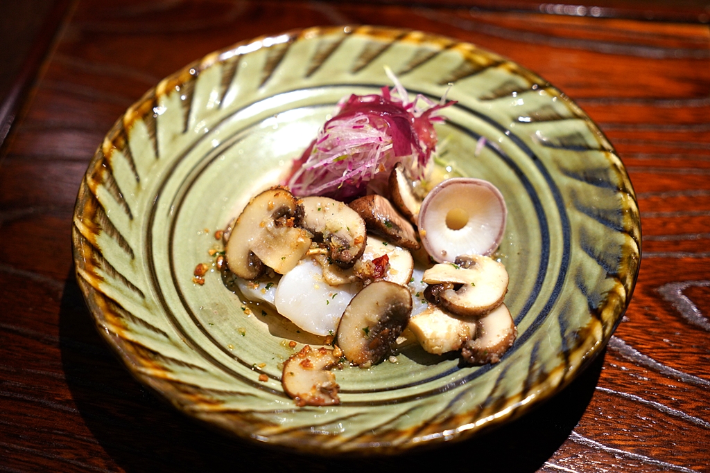 4th course : Sashimi [17/20] – ซาชิมิหนวดปลาหมึกนักษ์เนื้อหนึบแต่ก็นุ่มทานไม่ยากเสิร์ฟคู่กับเห็ดผัดพริกกระเทียมในน้ำมันร้อนๆที่เชฟจะเทราดลงไปบนหนวดปลาหมึกทันทีก่อนเสิร์ฟ