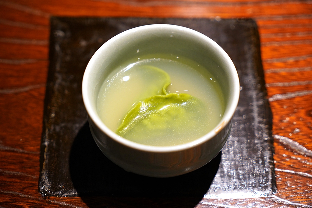 6th course : Scallop | Spinach [16/20] – เกี๊ยวผักโขมสอดไส้หอยเชลล์ที่ทำออกมาเป็นลูกชิ้นเหมือนไส้ของติ่มซำเสิร์ฟในซุปหอยอาซาริรสอูมามิร้อนๆ