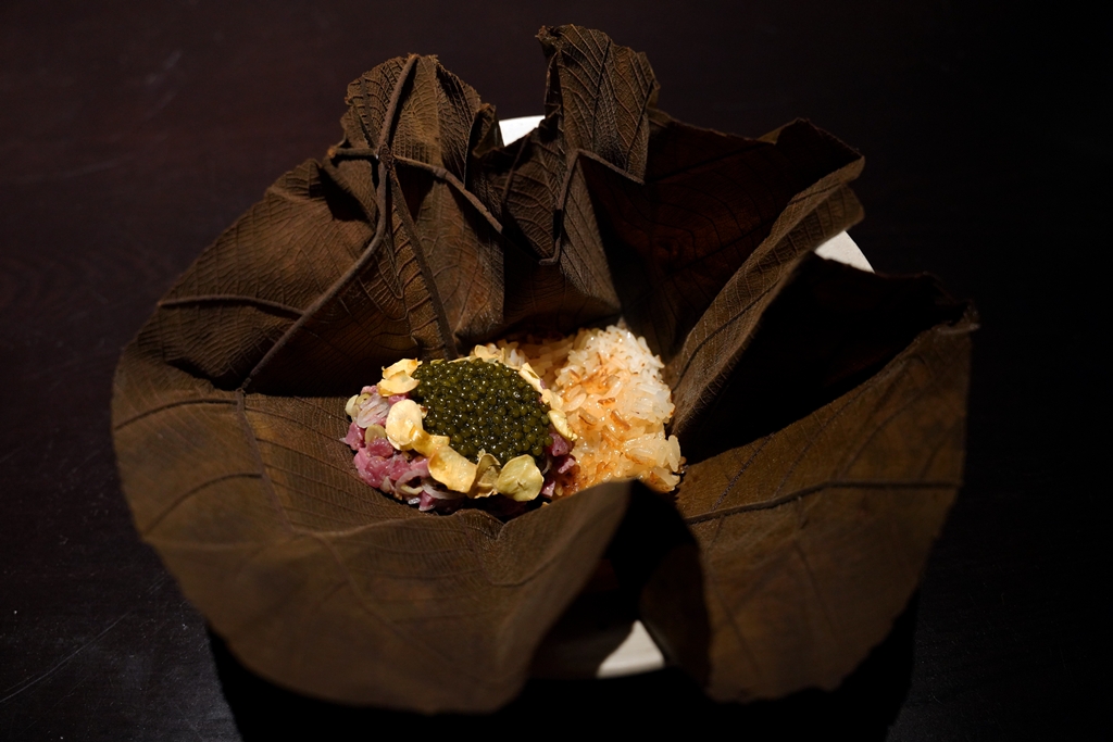 5th course : Adan rice steamed in mahang leaf, venison and kerdas [18/20] – บ๊ะจ่างข้าวสายพันธุ์ adan หอมๆเสิร์ฟคู่กับเนื้อกวางป่าหน้าไข่ปลาคาเวียร์จากฟาร์มที่มาเลเซียและสะตอมาเลเซียกรอบๆ