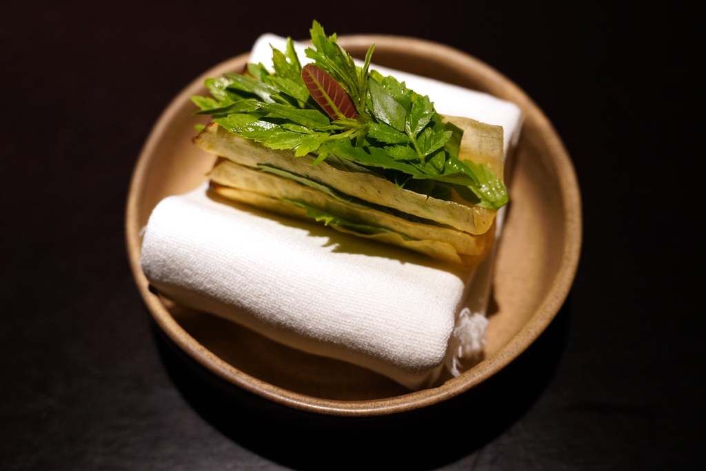 6th course : Greens on breadfruit crisp [17/20] – ทาโก้แบบผักล้วน 100% ที่ตัวแป้งทำจากเนื้อของสาโทและตัวไส้ก็ประกอบไปด้วยแห้วและผักสมุนไพรมาเลเซียหลากหลายชนิดที่หอมอร่อยสดชื่นมากๆ