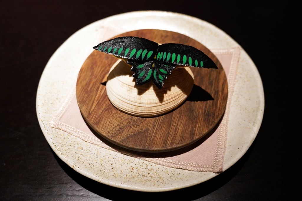 7th course : Rajah Brooke’s Birdwing – belinjau, labu siam, keranji [17/20] – ผีเสื้อประจำชาติของมาเลเซียในรูปแบบกินได้ที่ทำจากเนื้อฟักแม้ว เนื้อลูกหยีและผักเหมียง เมนูนี้อารมณ์คล้ายๆผลไม้กวนที่มีหลากรสหลากสัมผัส ถือว่าสวยงามและอร่อยจริง