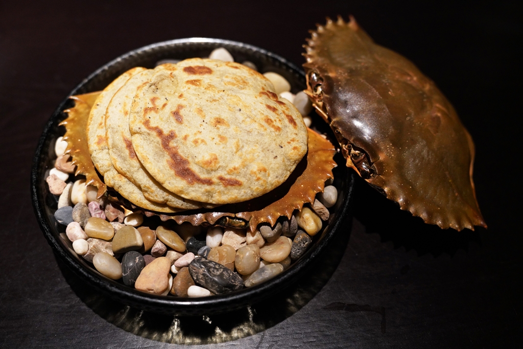 8th course : Braised cock’s crest with stone crab seasoned with salted litsea, ubi kemilik flatbread [15/20] – แกงหงอนไก่ตุ๋นเนื้อหนึบๆและเนื้อปูหินหวานๆที่ตัวแกงจะออกแนวหอมสมุนไพรเสิร์ฟคู่กับแผ่นแป้งที่ทำจากมันฝรั่ง kemilik เนื้อนุ่มๆ