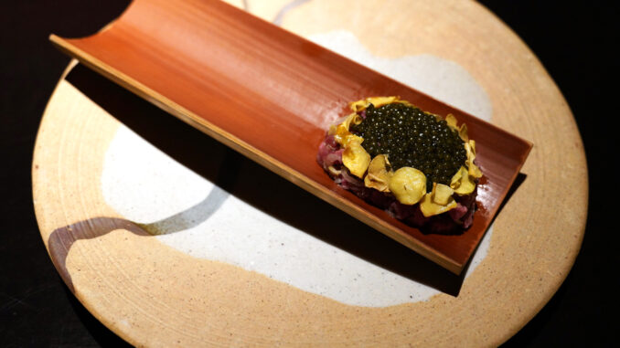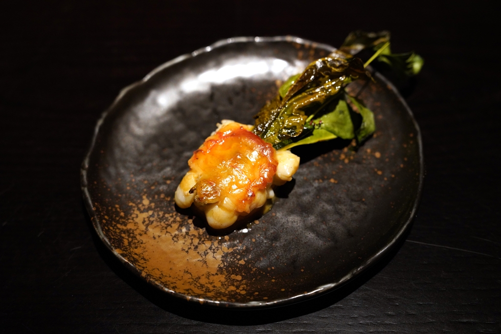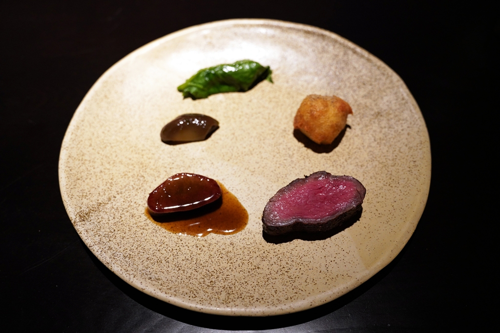 9th course : Retired dairy cow beef plate [16/20] – เมนคอร์สที่นำเสนอวัวนมที่เกษียณอายุแล้วที่ใช้ทั้งส้วนเนื้อมาทำเสต็กรสเข้มข้น ส่วนลิ้นตุ๋นเนื้อนุ่มๆและส่วนสมองที่นำมาเทมปุระจนกรอบสีเหลืองทอง เสิร์ฟคู่กับสละดองรสเปรี้ยวและผักย่าง