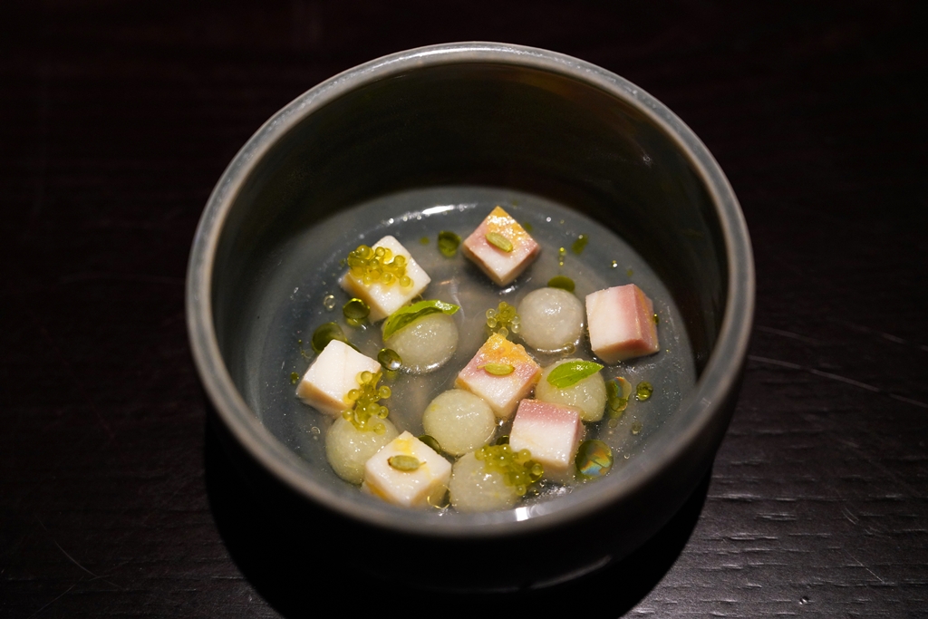 1st course : Hot smoked sturgeon from Tanjung Malim in cold button mangosteen soup with sea grapes [16/20] – เนื้อปลาสเตอร์เจียนรมควันหั่นเต๋าเสิร์ฟในน้ำซุป cerapu ที่เป็นผลไม้สีส้มตระกูลมังคุดรสเปรี้ยวสดชื่นพร้อมด้วยสาหร่ายพวงองุ่น