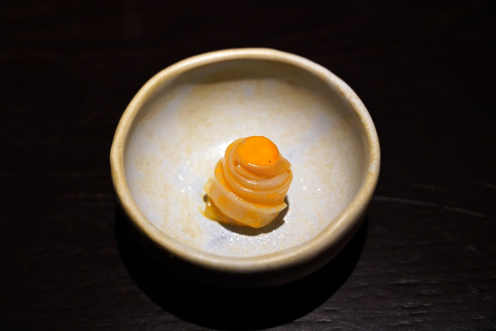 3rd course : Cuttlefish cured in venison garum and crab roe with reduced guava dressing [15/20] – เนื้อปลาหมึกหั่นเส้นที่ดองในน้ำปลาเนื้อกวางหมักที่ทางร้านทำเองห่อกับไข่ปูปรุงรสด้วยเดรซซิ่งน้ำฝรั่ง