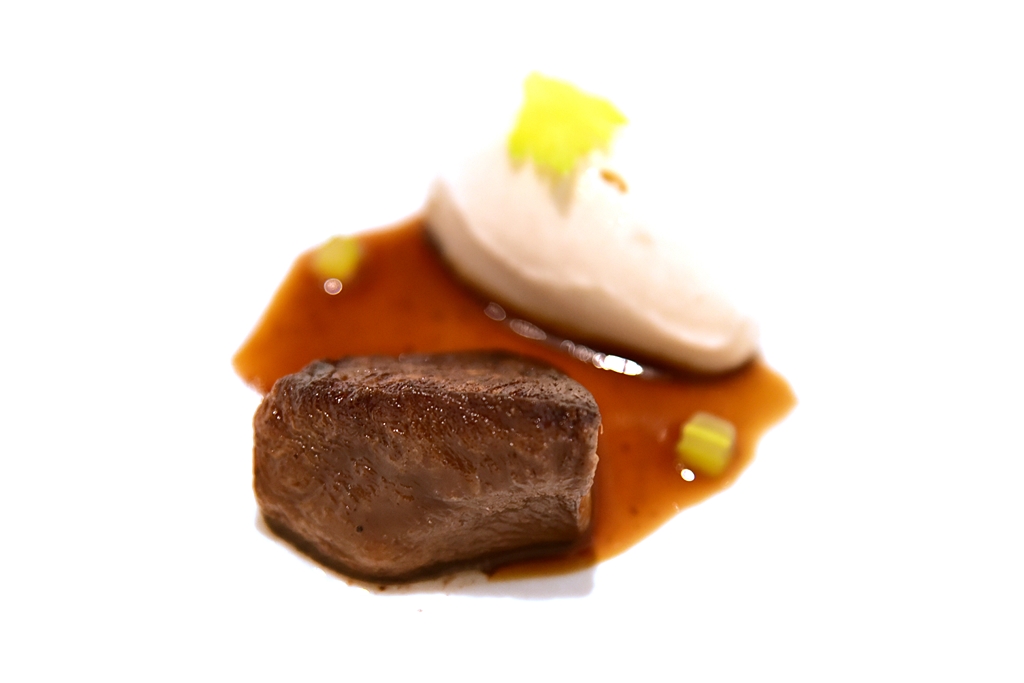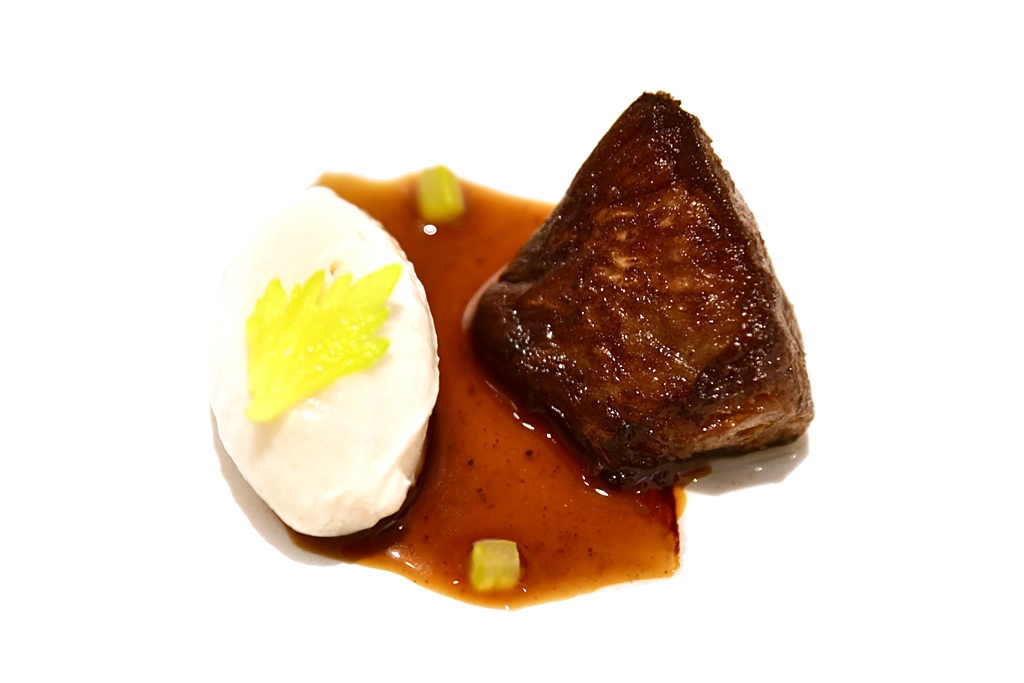 10th course: Black Celeriac – รากขึ้นช่ายที่ทำการปรุงออกมาคล้ายกับเนื้อสเต็กเสิร์ฟคู่กับไอศกรีมขึ้นช่ายที่เข้ากันได้อย่างลงตัวมากจนน่าตกใจ