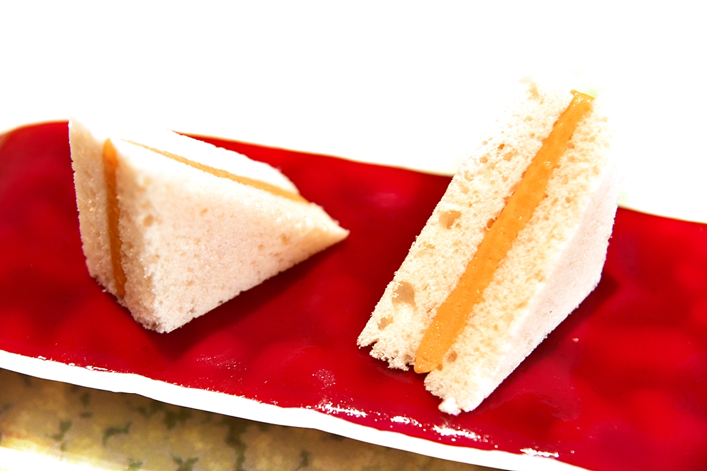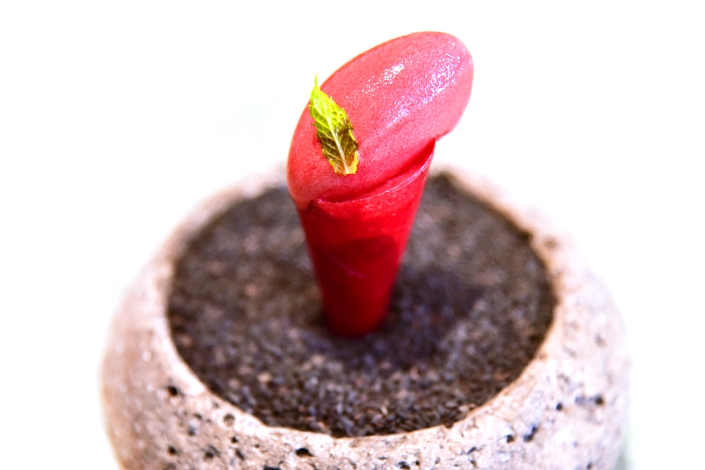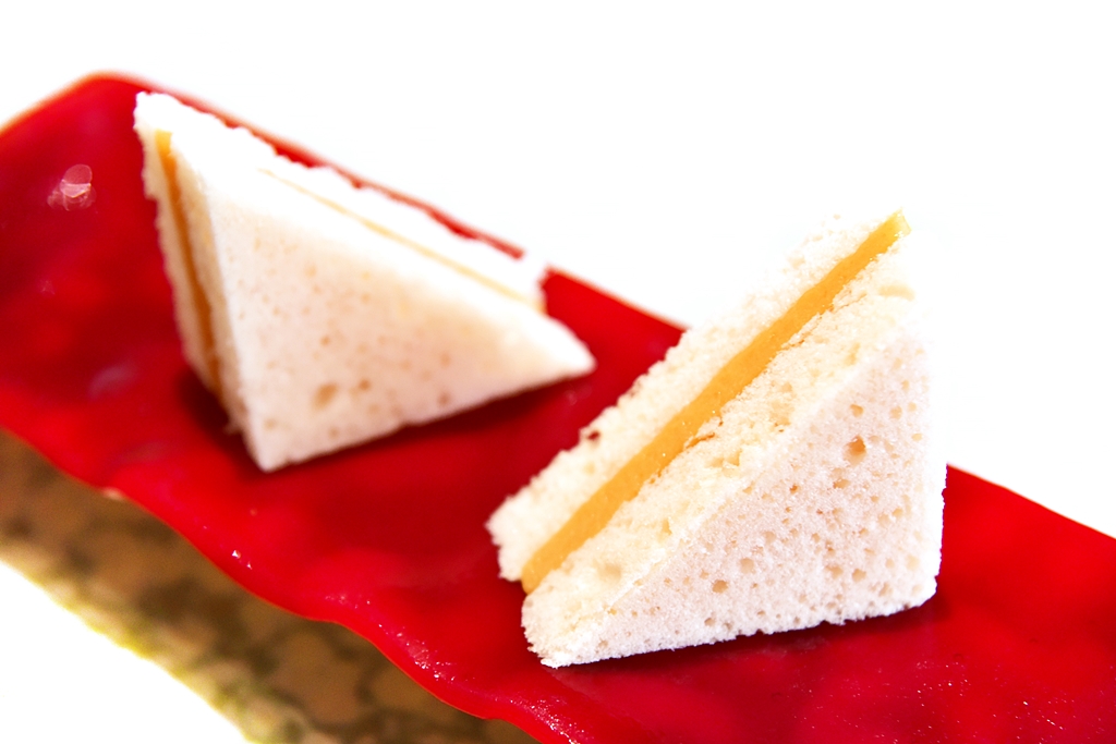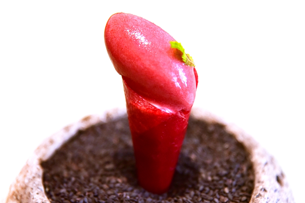 8th course: Gazpacho Sandwich with Scented Vinegar Garnish – แซนด์วิชซุปมะเขือเทศพริกหวานและน้ำส้มสายชูแบบเย็นจัด ถือเป็นเมนูซิกเนเจอร์ของร้านที่เอาของคาวมาเสิร์ฟแบบเย็นและเปลี่ยนรสสัมผัสใหม่หมดได้อย่างน่าสนใจมาก