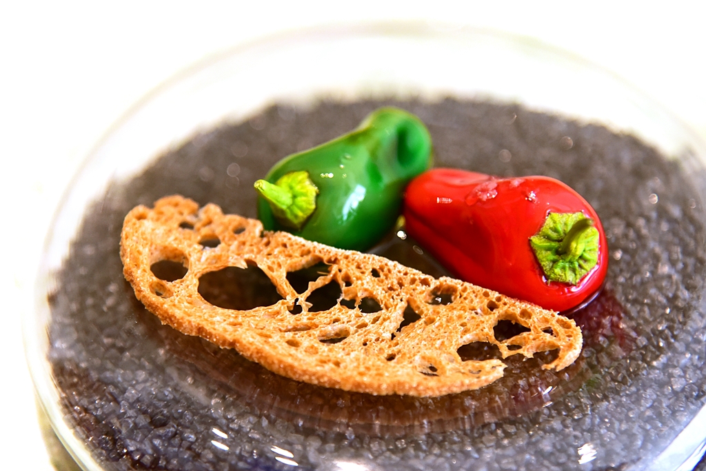 27th course: Chocolate Peppers, Oil and Salt – พริกหวานปลอมสอดไส้ช็อกโกแลตน้ำมันมะกอกและเกลือเสิร์ฟพร้อมกับขนมปังกรอบ