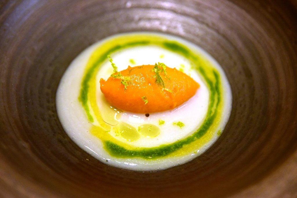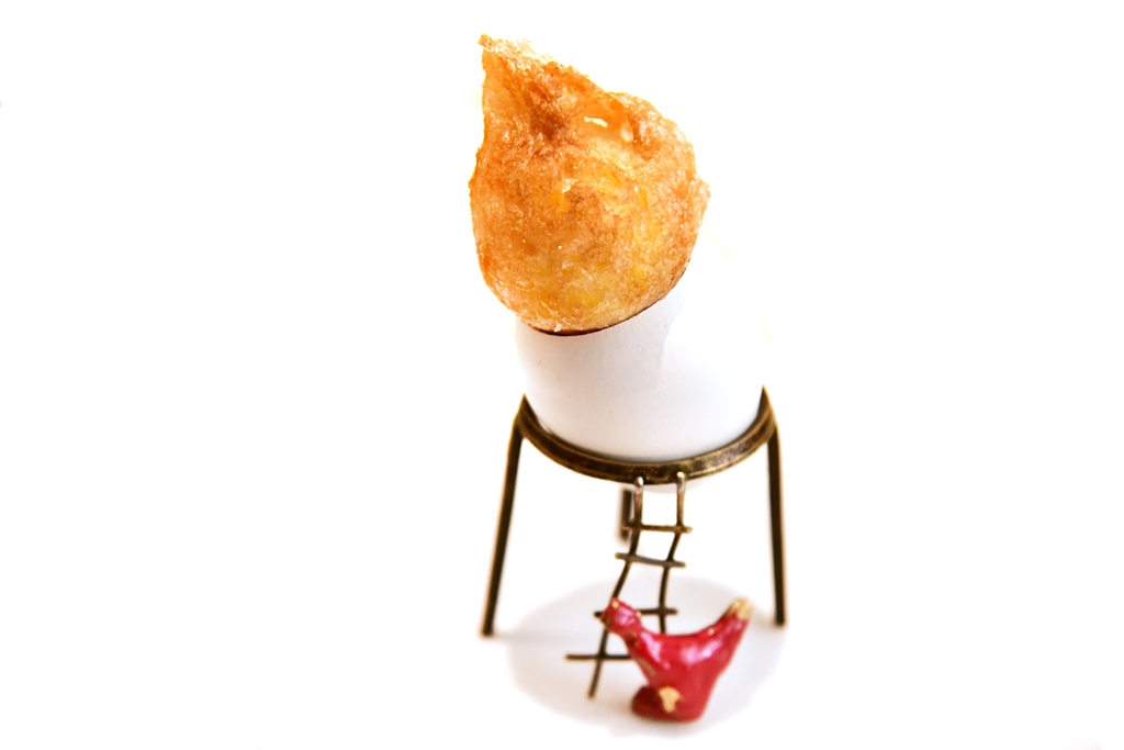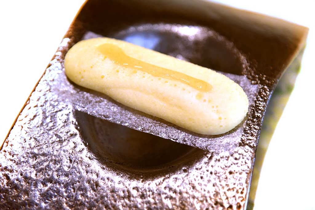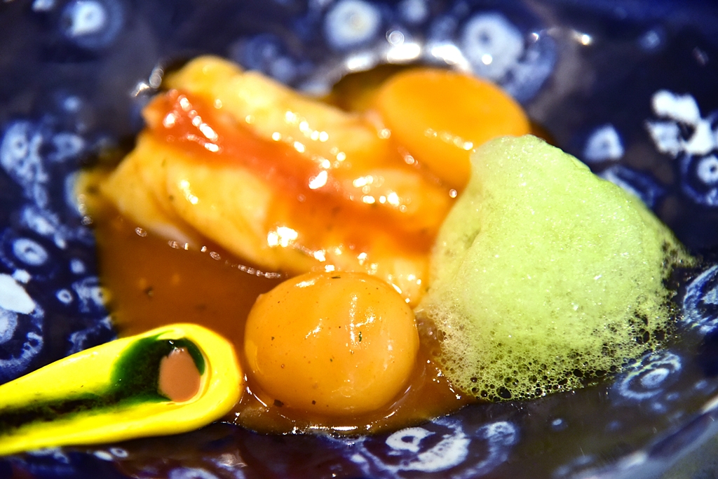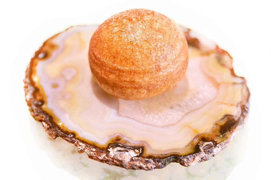 11th course: Crispy Egg Yolk with Warm Mushrooms Gelatin – ไข่ชุบแป้งทอดกรอบเสิร์ฟคู่กับเจลลี่เห็ดเข้มข้น เวลาทานต้องเจาะไข่แดงให้ไหลลงไปรวมกับเจลลี่ก่อนแล้วค่อยทานด้วยกัน
