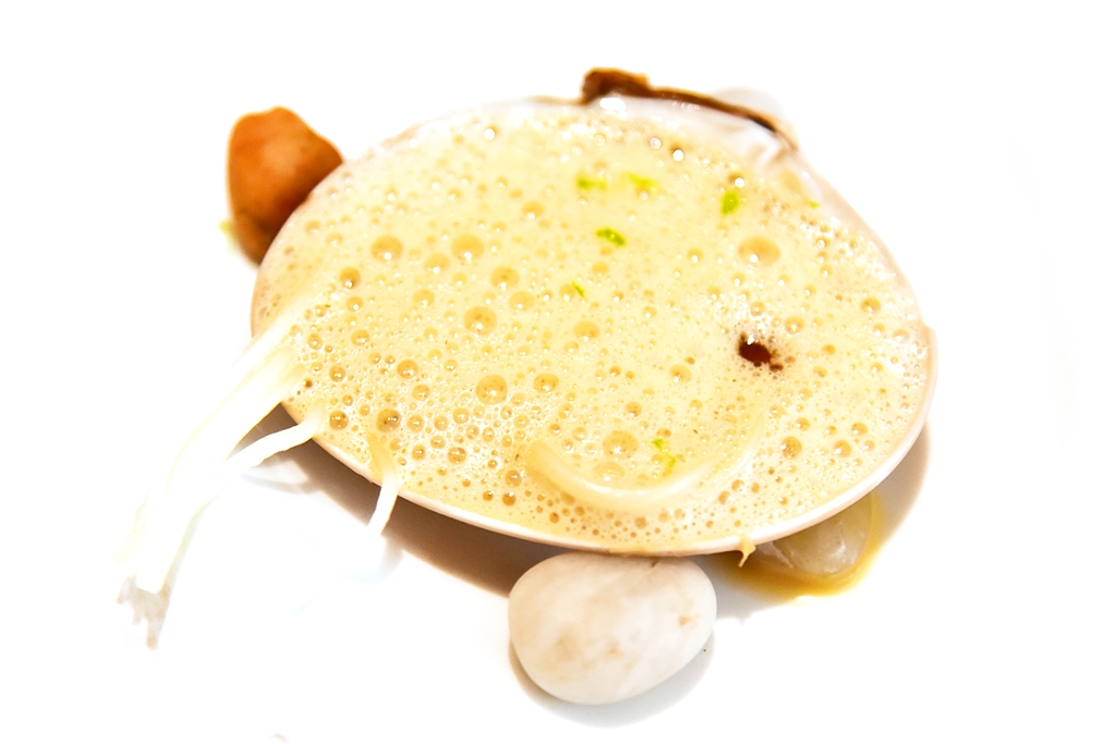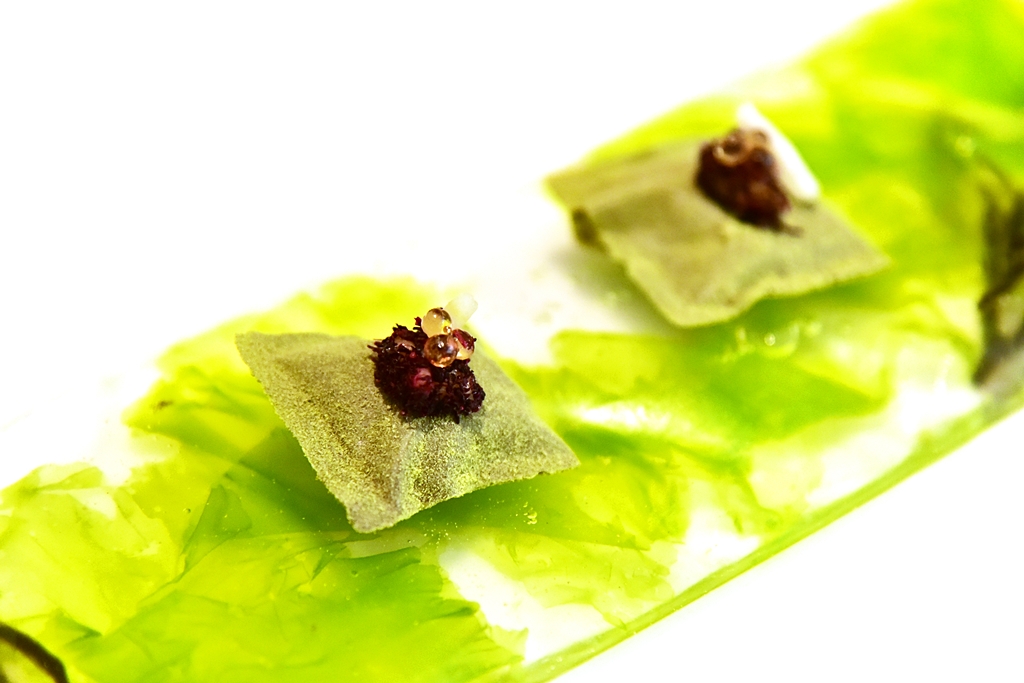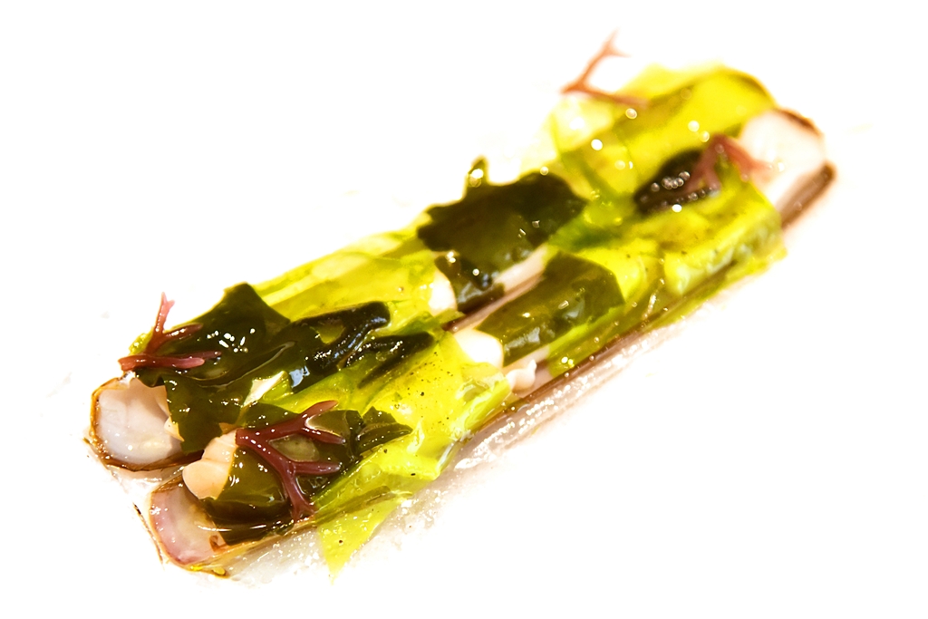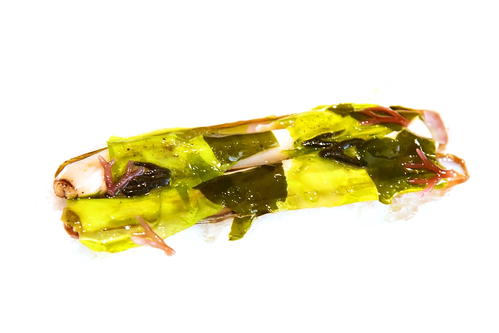 14th course: Salt-cured Razor Clams with Seaweed – หอยงวงช้างเนื้อหวานฉ่ำที่ผ่านการหมักด้วยเกลือเสิร์ฟคู่กับสาหร่ายนานาชนิด