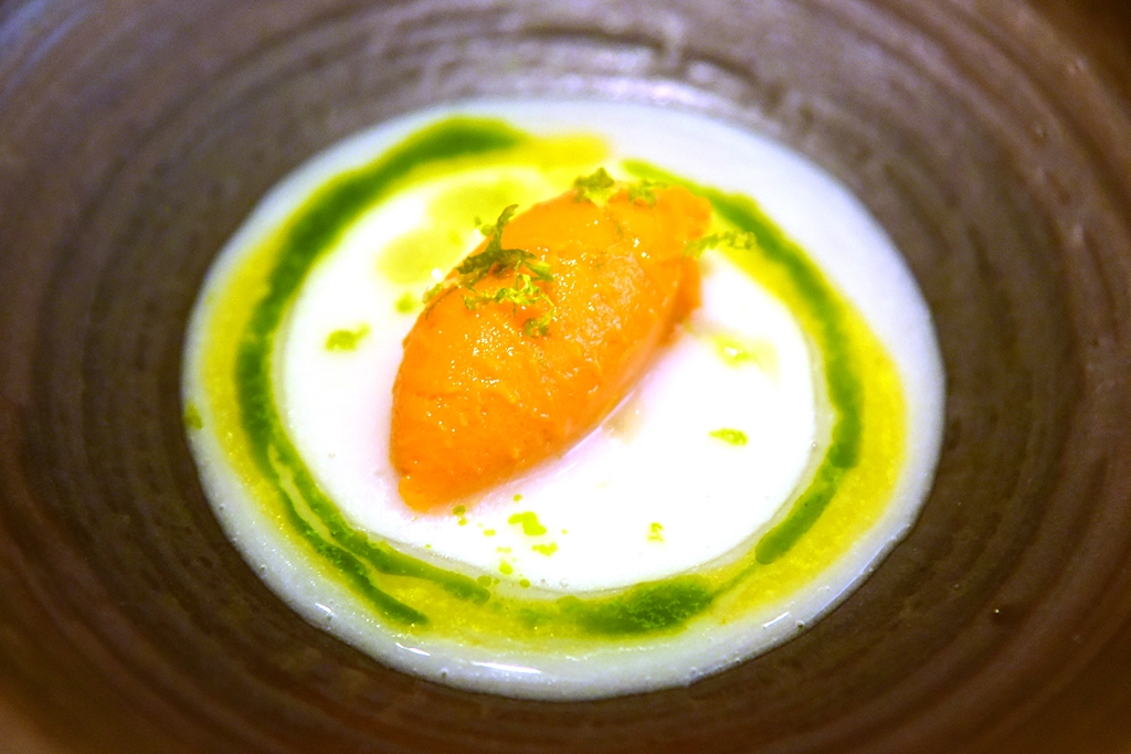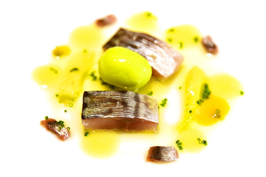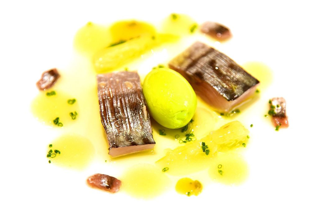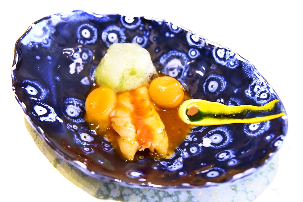 9th course: Disfrutar’s Gilda – เนื้อปลาซาร์ดีนสดเสิร์ฟกับมะกอกและปลาเค็มในสไตล์ของ Disfrutar ที่ทำออกมาได้รสชาติจัดจ้านและมีความน่าสนใจสูงมาก ตัวมะกอกนี่เป็นเซอร์ไพรส์ที่ต้องมาทานเองจริงๆครับ