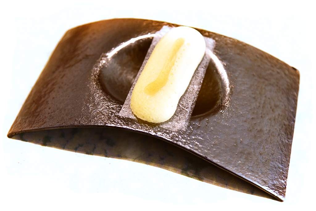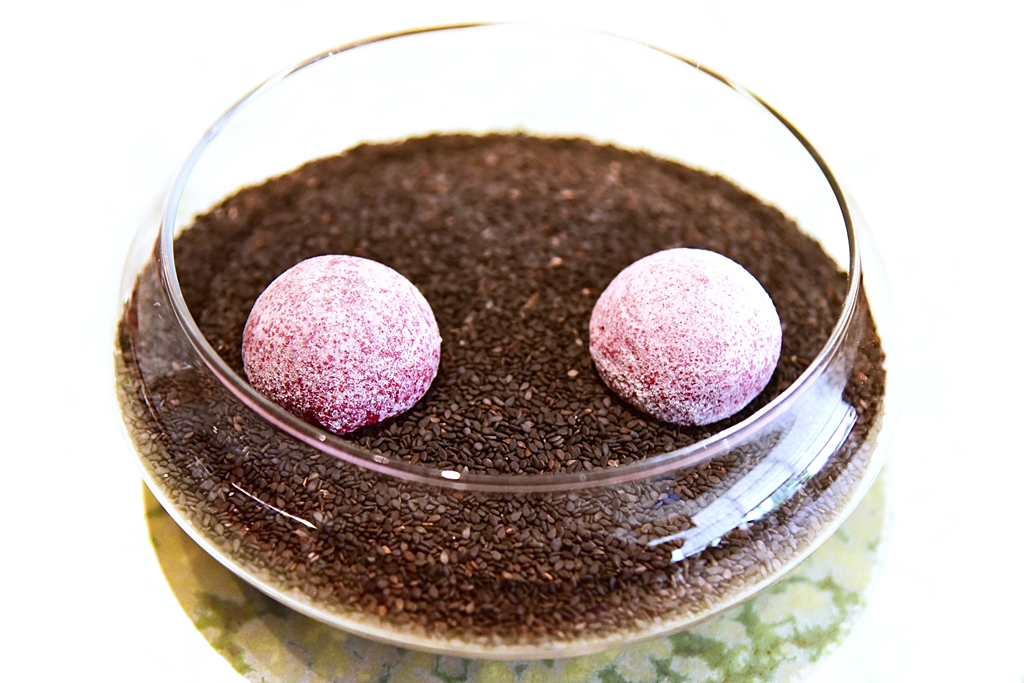 21th course: Hare and Foie Gras Bonbon – ฟัวกราส์บดรสเข้มข้นเคลือบด้วยช็อกโกแลตสำหรับทานคู่กับซุปกระต่ายเย็น