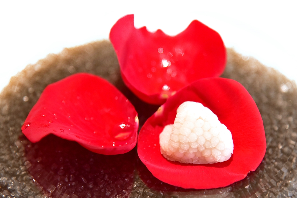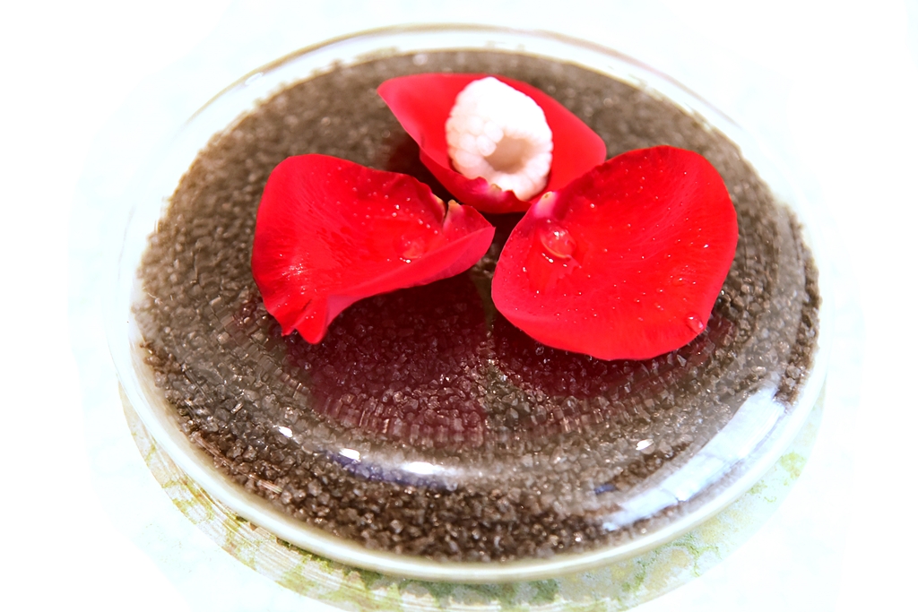 2nd course: Lychee and Roses with Gin – ลิ้นจี่เย็นจัดเสิร์ฟบนกลีบกุหลาบหอมๆคู่กับสเฟียร์เหล้าจินรสเข้มข้น