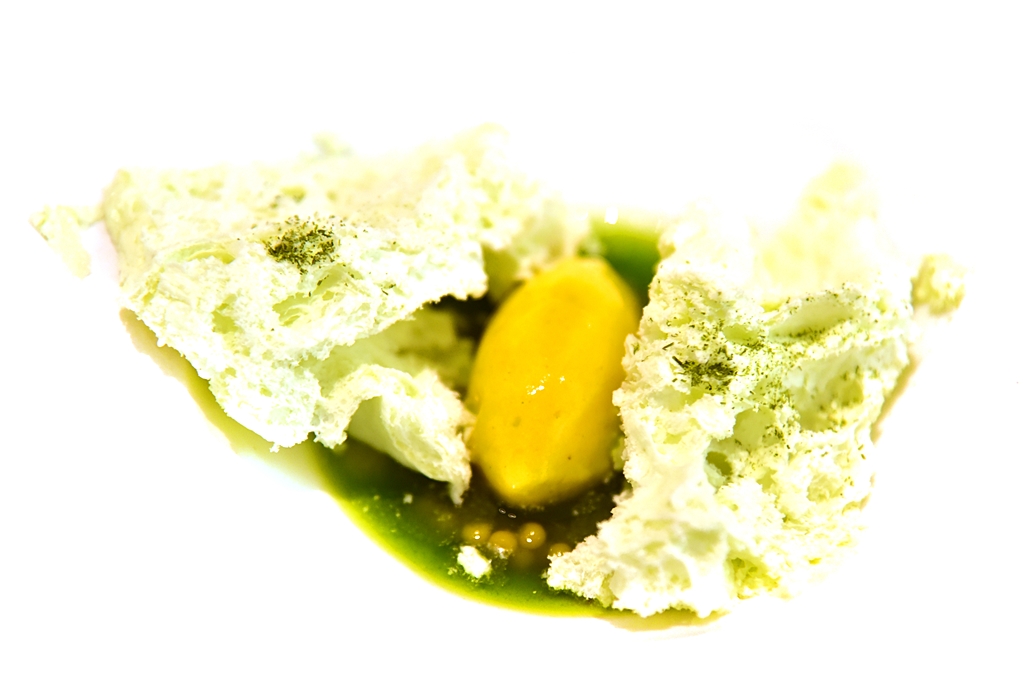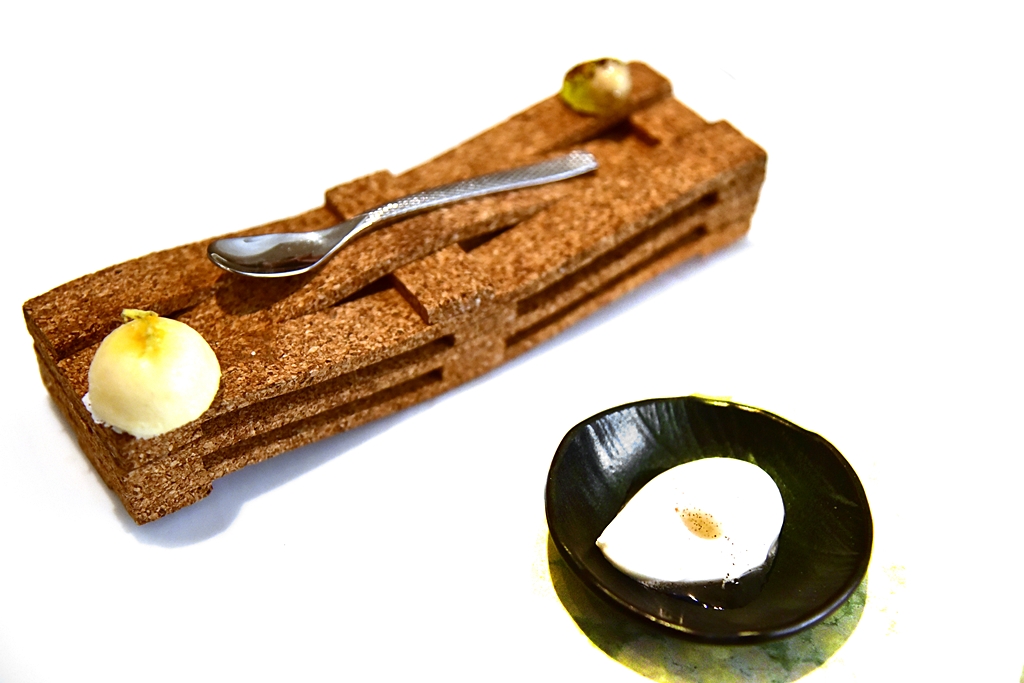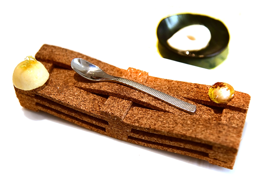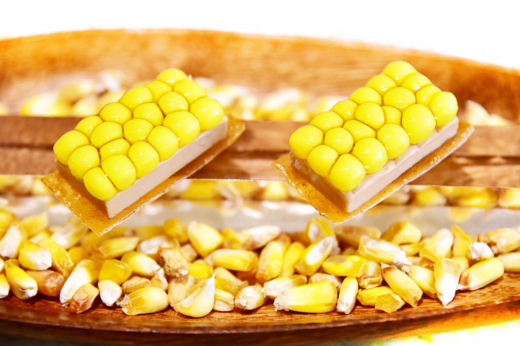 23th course: Multi Spherical Tatin of Corn and Foie – ทาร์ตฟัวกราส์หน้าสเฟียร์ข้าวโพดเม็ดเล็กที่เคี้ยวแล้วจะแตกในปากทีละเม็ด ถือเป็นเมนูที่เต็มไปด้วยเทคนิคชั้นเซียนและยังอร่อยกับสวยงามมากๆ