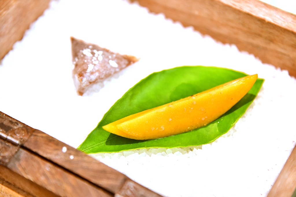 5th course: Savory Walnut Candy with Mango, Tonka Beans and Whisky – ลูกกวาดวอลนัททานได้ทั้งชิ้นเสิร์ฟคู่กับมะม่วงที่ผ่านการอินฟิวส์ด้วยวิสกี้จนชุ่มฉ่ำ