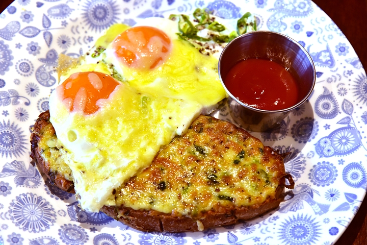 2. Kejriwal (5.90 GBP) – ขนมปังหน้าชีสผสมพริกและเครื่องเทศสไตล์อินเดียเสิร์ฟคู่กับไข่ดาว 2 ฟอง