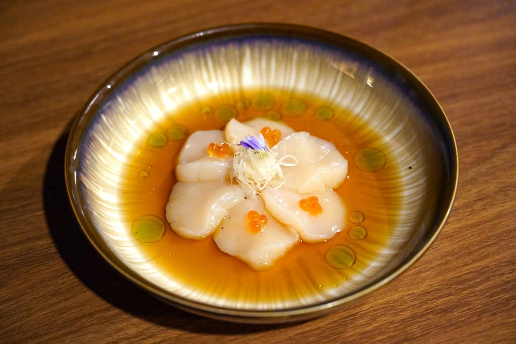 3. Hotate Crudo (420++ THB) [15/20] – หอยเชลล์ดิบเนื้อหวานนุ่มเสิร์ฟกับไข่ปลาแซลมอนและซอสยูสุพอนสึผักชีลาว