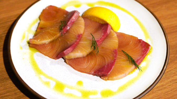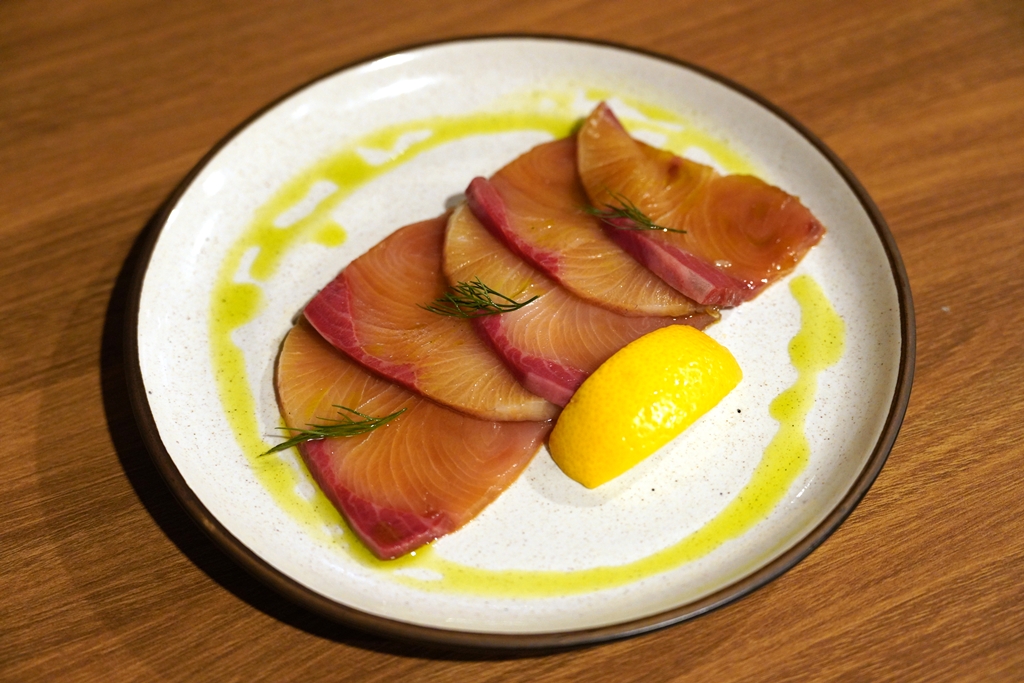 2. Hamachi Crudo (420++ THB) [15/20] – ปลาฮามาจิดิบชิ้นหนาเหนือสดเด้งถูกต้องเสิร์ฟในน้ำมันมะกอกกับมะนาวและผักชีลาว