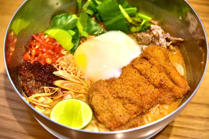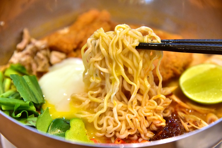 2. Bamee Instant Noodle Tomyum (160+ THB) – บะหมี่กึ่งสำเร็จรูปต้มยำไข่ลวกรสเข้มข้นเสิร์ฟคู่กับไก่ทอดและหมูฉีก