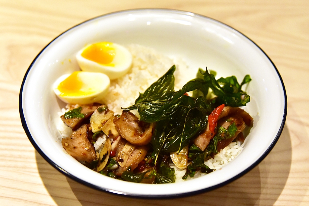 5. Grilled Pork Neck Basil Don with Soft-Boiled Egg (180+ THB) – ข้าวหน้าคอหมูย่างผัดใบโหระพาและไข่ต้ม