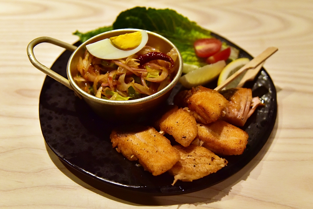 3. Grilled Salmon Skewer with Spicy Pomelo Salad (220+ THB) – แซลม่อนย่างเสียบไม้เสิร์ฟคู่กับพล่าส้มโอไข่ต้ม