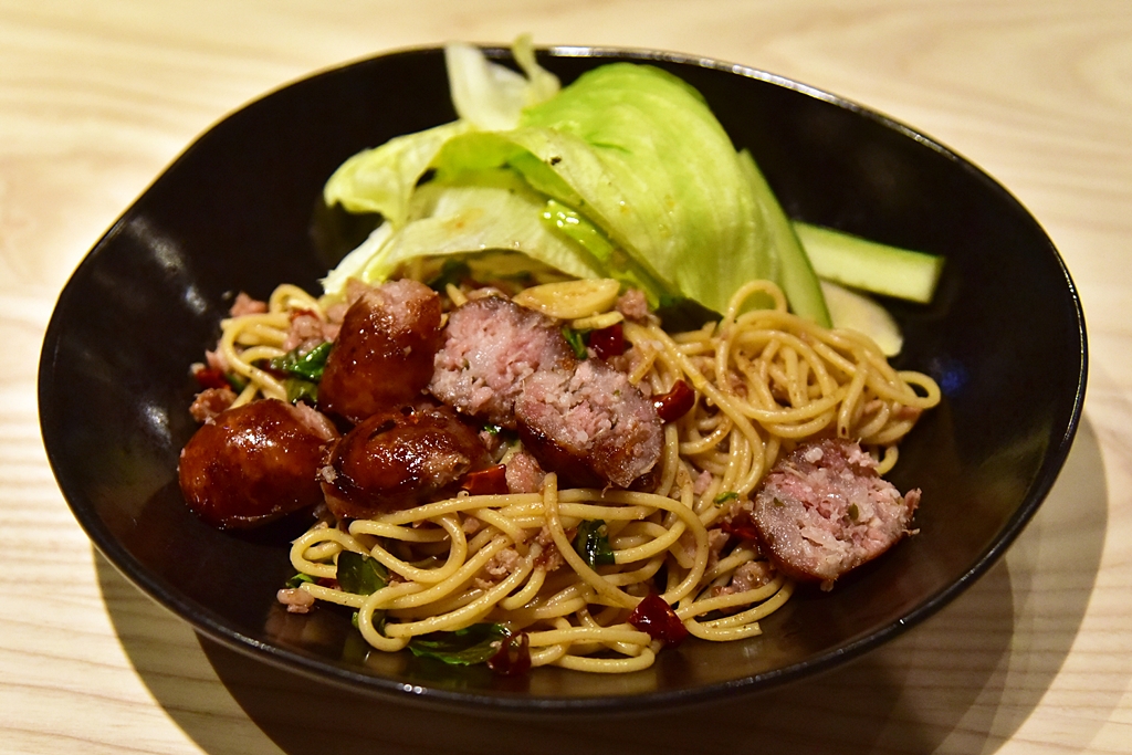 4. Spicy Isaan Sausage Spaghetti (170+ THB) – สปาเก็ตตี้ผัดไส้กรอกอีสานรสชาติจัดจ้าน ถือเป็นจานเด่นที่สุดของมื้อ
