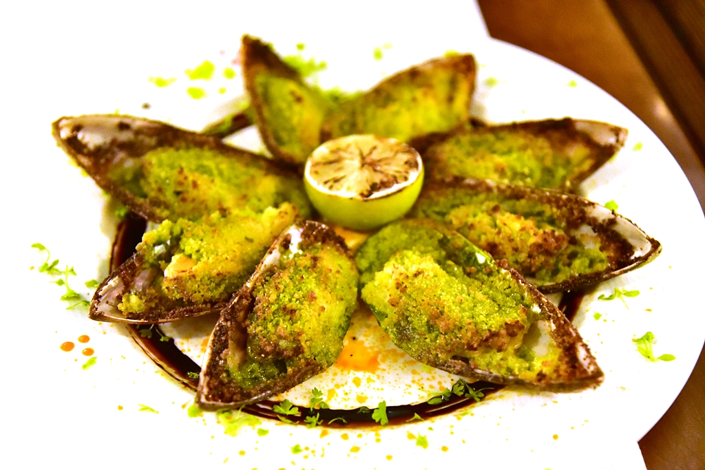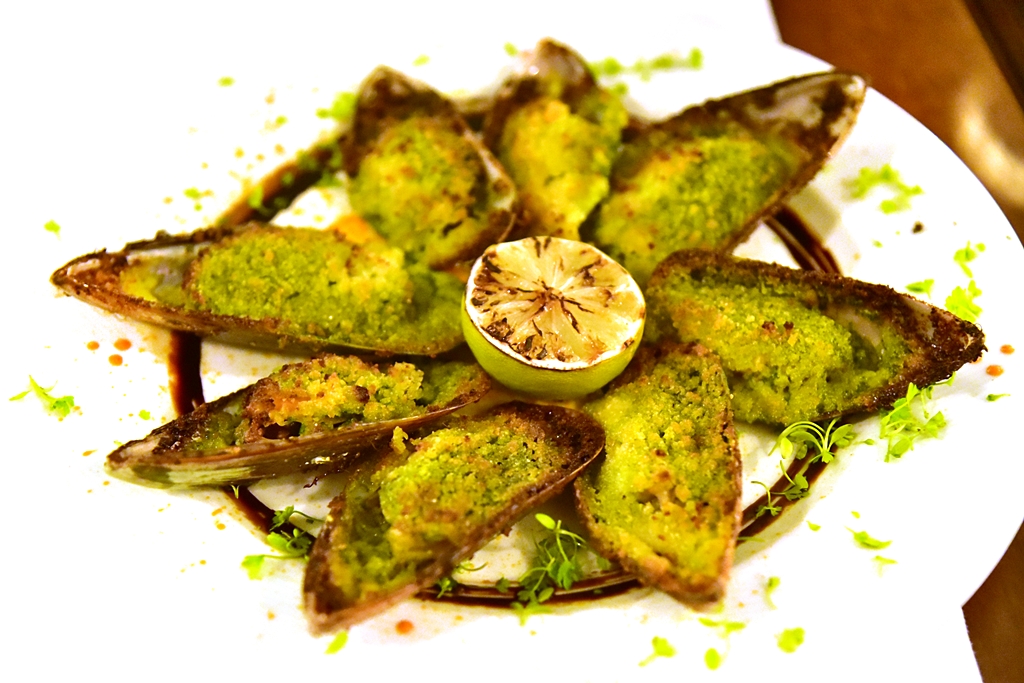 1. Mussel Gratin with Corn Bread Crust and Lime (12.00 EURO) – หอยแมลงภู่กราแตงโปะเกล็ดขนมปังกรอบเสิร์ฟคู่กับเลม่อน