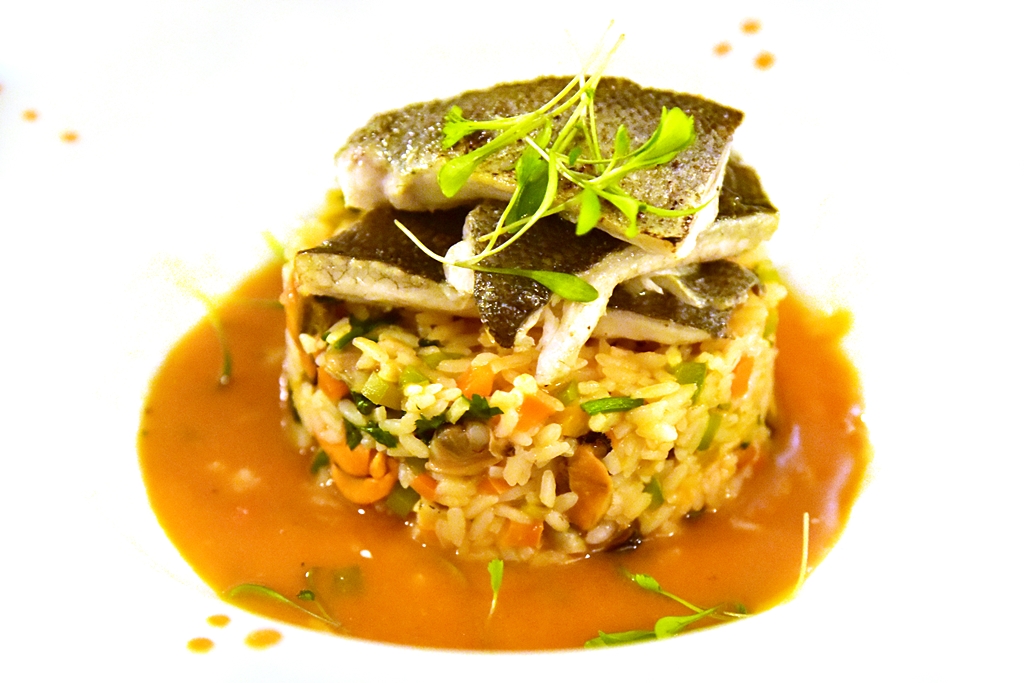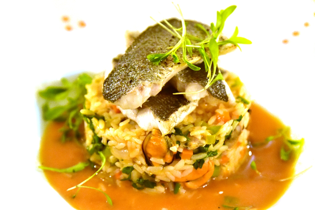 5. Sea Bass Fillets with Seafood Rice (18.00 EURO) – ข้าวต้มทะเลสไตล์โปรตุเกสเสิร์ฟคู่กับปลากระพงย่างหนังกรอบ