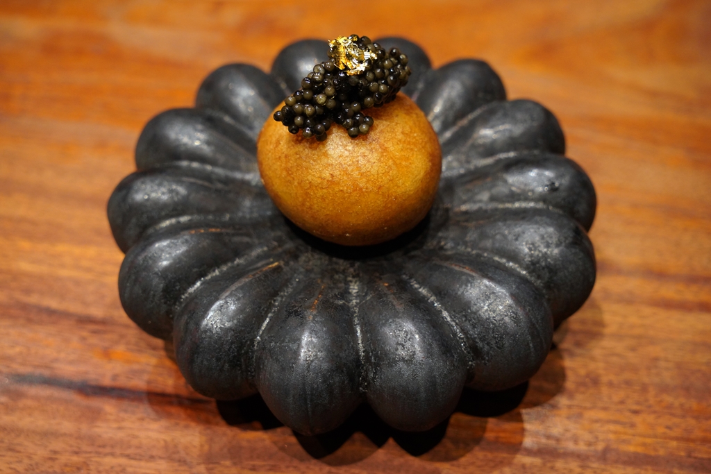 1. Caviar Bun (690++ THB) [15/20] – ซาลาเปาแป้งบางกรอบสอดไส้ซาวร์ครีมกับไข่แดงเสิร์ฟคู่กับไข่ปลาคาเวียร์