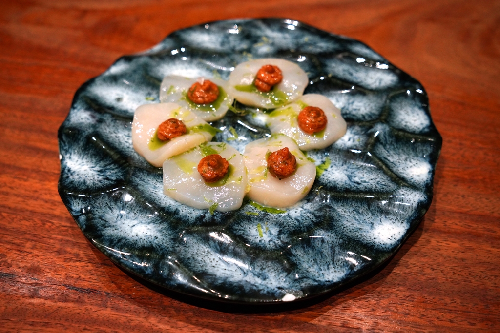5. Hotate Crudo (450++ THB) [16/20] – ซาชิมิหอยเชลล์ฮอกไกโดเสิร์ฟคู่กับซอสมายองเนสเครื่องเทศรสเผ็ดและน้ำมันต้นหอม