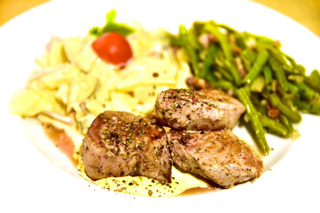 3. Pork Medallions served with Green Beans, Bacon and Bearnaise Sauce (14.50 EURO) – สเต็กเนื้อหมูย่างหอมๆเสิร์ฟคู่กับผัดถั่วฝักยาวเบค่อน สลัดมันฝรั่งและซอสครีมเนยหอมเข้ากัน