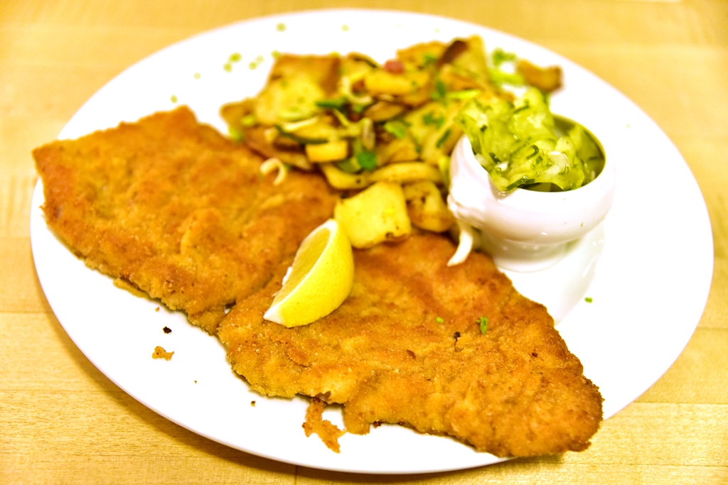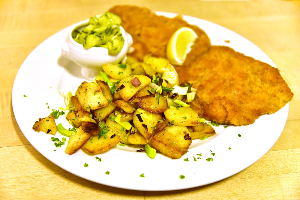 2. Wiener Schnitzel with Home-made Cucumber Salad (17.95 EURO) – เนื้อลูกวัวแผ่นบางชุบแป้งทอดที่หอมอร่อยเสิร์ฟคู่กับสลัดแตงกวาและมันฝรั่งผัดเบค่อน