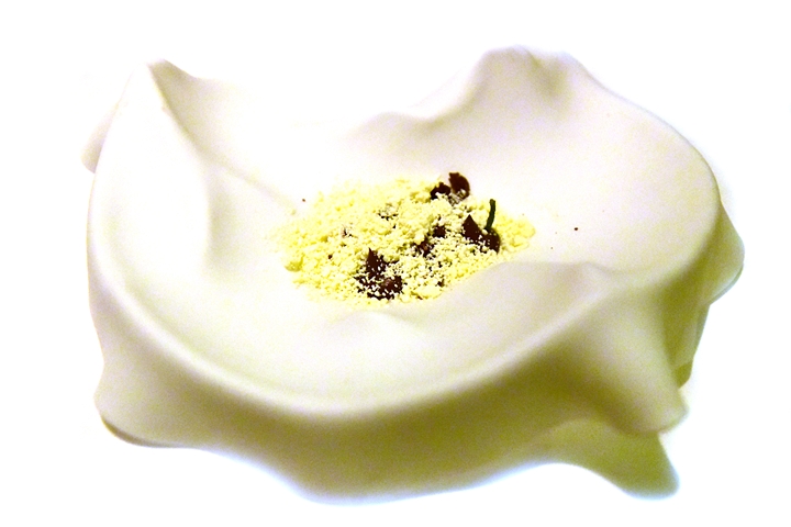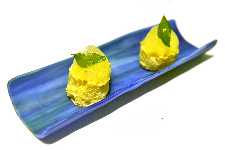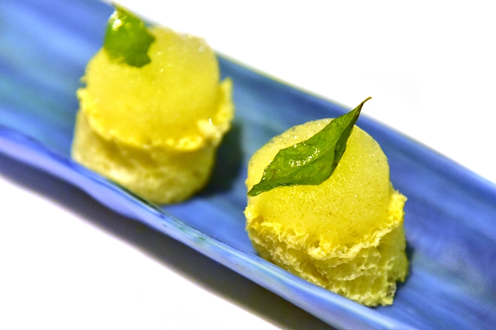 7th course : Idly Sambar – เค้กข้าวอินเดียนสไตล์อินเดียตอนใต้สอดไส้ครีมมะพร้าวและโฟมถั่วเลนทิล