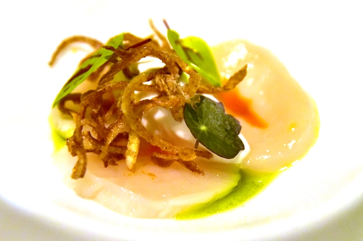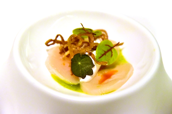 17th course : Scallops Uncooked Curry – แกงหอยเชลล์ฮอกไกโดเสิร์ฟเย็นคู่กับไอศกรีมมะพร้าว หอมทอดและเครื่องเทศอินเดีย